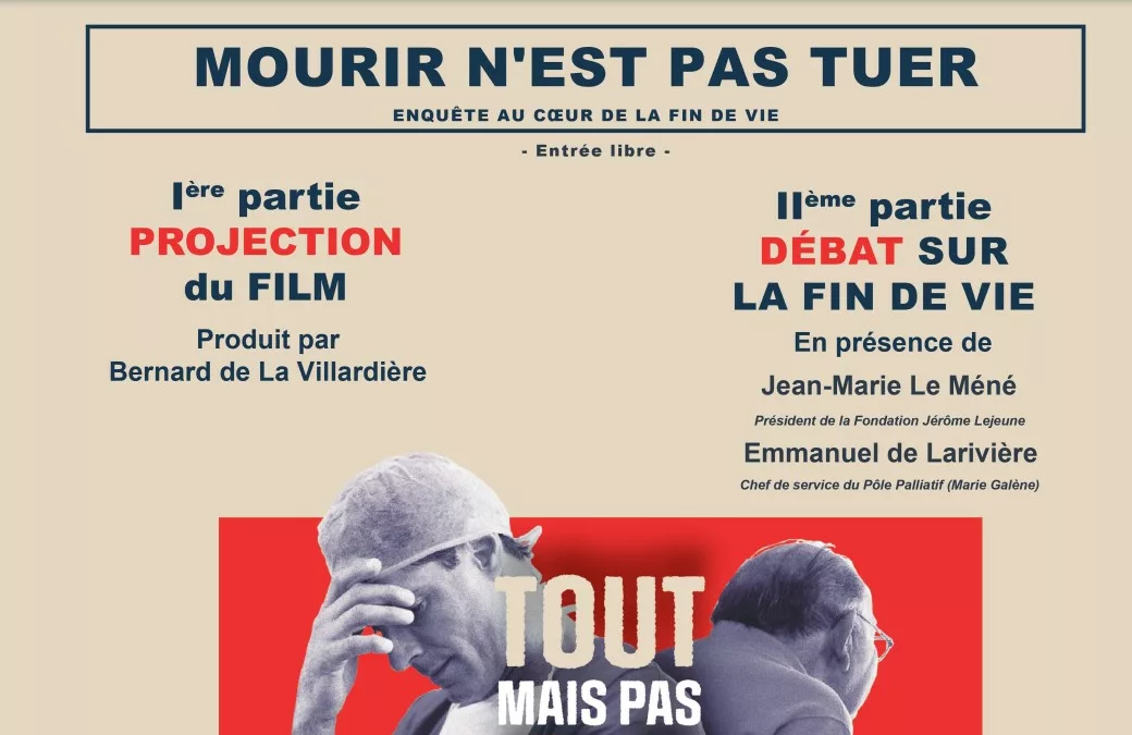 Cette belle soirée est co-organisée par la fondation Jérôme Lejeune (et son président, Jean-Marie le Méné, nous fait le plaisir de revenir cette année) et votre AFC. Elle débutera à 20h00 par la projection du film produit par le célébre reporter Bernard de la Villardière (et réalisé par Géraud Burin des Rosiers) : « Mourir n’est pas tuer », une enquête au coeur de la fin de vie.